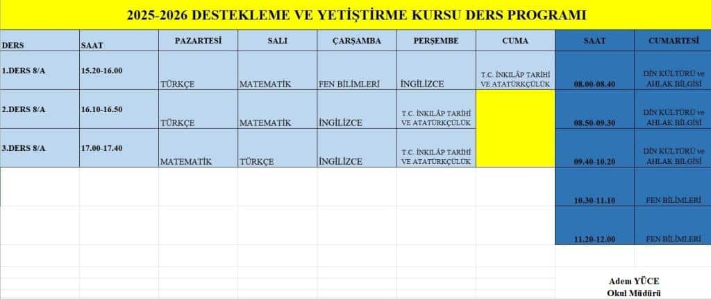 DESTEKLEME VE YETİŞTİRME KURSU HAFTALIK DERS PROGRAMIMIZ AŞAĞIDAKİ GİBİDİR.